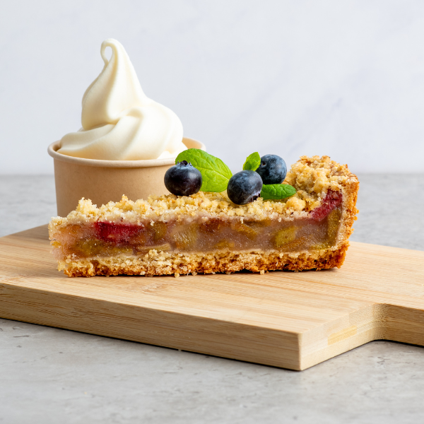 Klassisk rabarbertærte med saftig rabarberfyldning og sprød, crunchy topping. Velegnet som kage til kaffe og te eller som en del af en kage- og dessertbuffet i professionelle serveringsmiljøer.