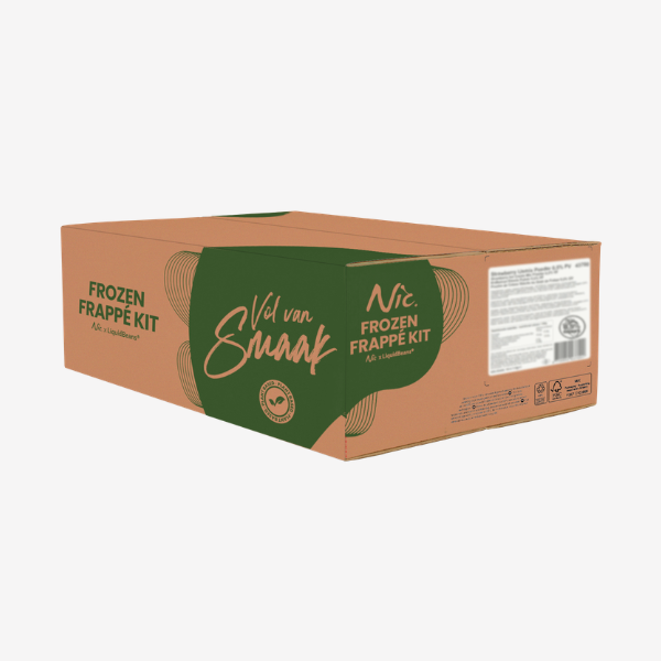Frozen Frappé kit med 8 sæt base mix og kaffe essence. Blandes med vand og kan bruges i almindelig slushicemaskine. Giver en cremet og ensartet kaffedrik til professionelt brug.