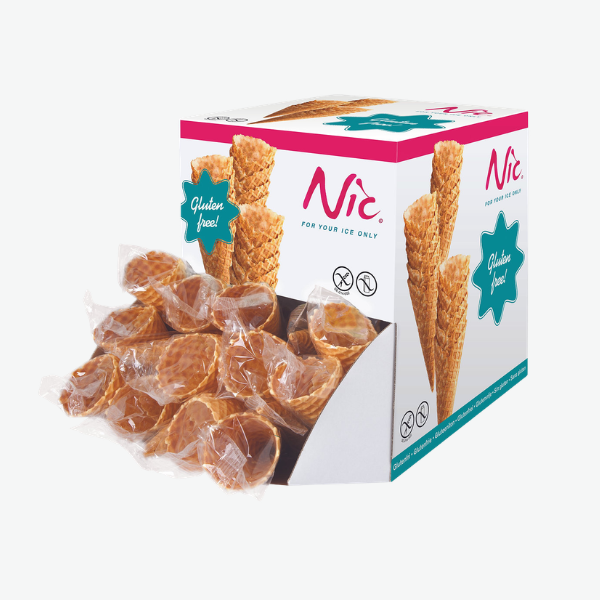 Glutenfri isvaffel udviklet til at sikre, at alle kunder kan nyde en isvaffel uden kompromis. Vaflen har en let og sprød struktur samt en mild, klassisk smag, der passer godt til både softice og kugleis. De glutenfrie vafler leveres enkeltindpakkede, hvilket gør dem nemme og hygiejniske at håndtere i travle caféer og ishuse. En praktisk og tryg løsning til servering af glutenfri is, der understøtter et inkluderende sortiment og giver kunderne et godt alternativ med fokus på kvalitet.