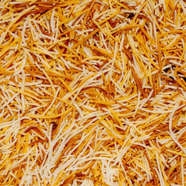 Sprøde dejtråde i 500 g pose. Velegnet som topping på is og i desserter, hvor der ønskes knas og tekstur. Til professionelt brug.