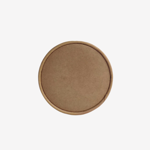 Låg i brun pap til bæger ISCB8 med PE-coating. Velegnet til take-away – leveres i pakker med 500 stk.
