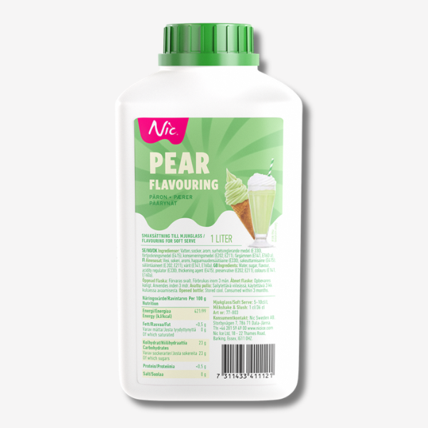 Smagtilsætning med pæresmag til softice og milkshakes. Giver en mild og ensartet frugtsmag og gør det nemt at variere sortimentet. Leveres i 1 liters flaske.