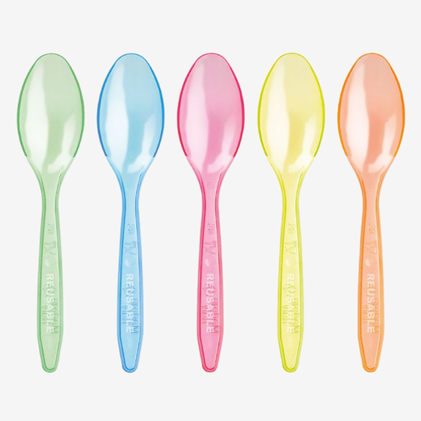 Multifarvede skeer til flergangsbrug på 13 cm, godkendt til opvaskemaskine op til 125 vaske ved maks. 65 °C. Leveres i 1 kg pakke med ca. 500 stk.