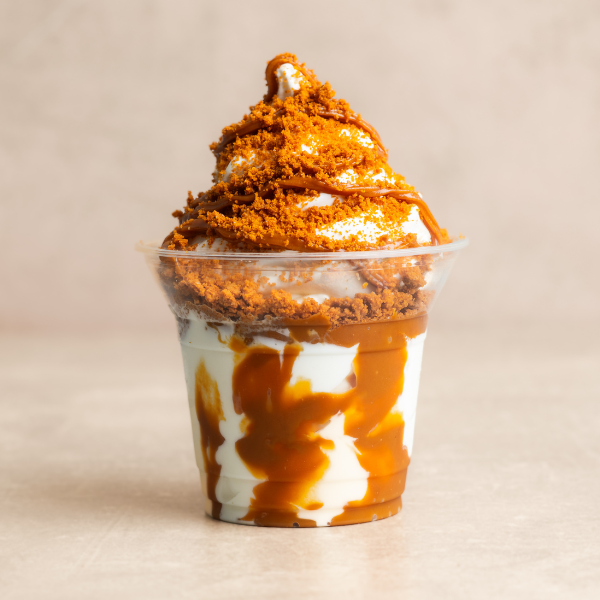 Herefter fyldes koppen helt op med endnu et lag softice, så den får en flot og indbydende swirl. På toppen topper vi med Biscoff toppingsauce og afslutter med et drys Biscoff crunch, som giver et skønt knas og fuldender den appetitlige softice cup.